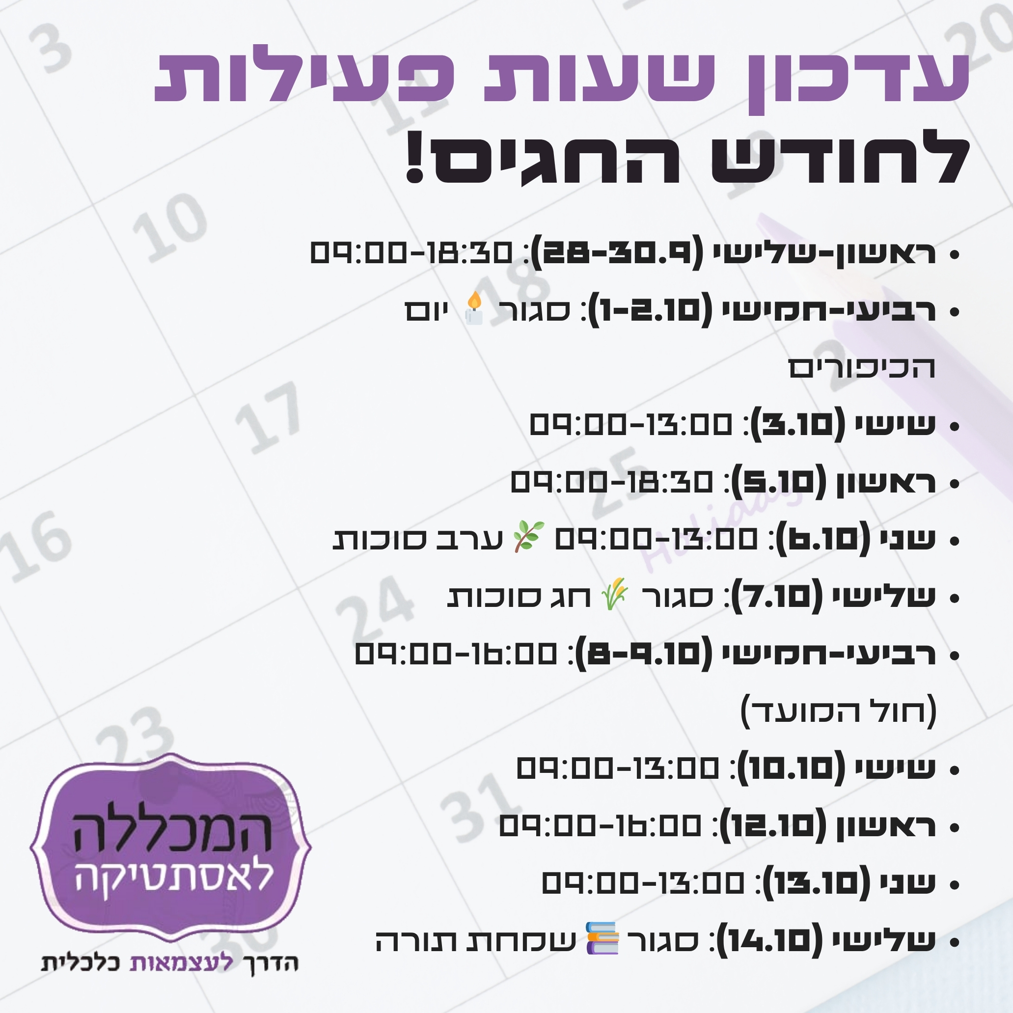 ימי ראשון עד חמישי – 9:00-18:00שישי וערבי חג – 9:00-13:00